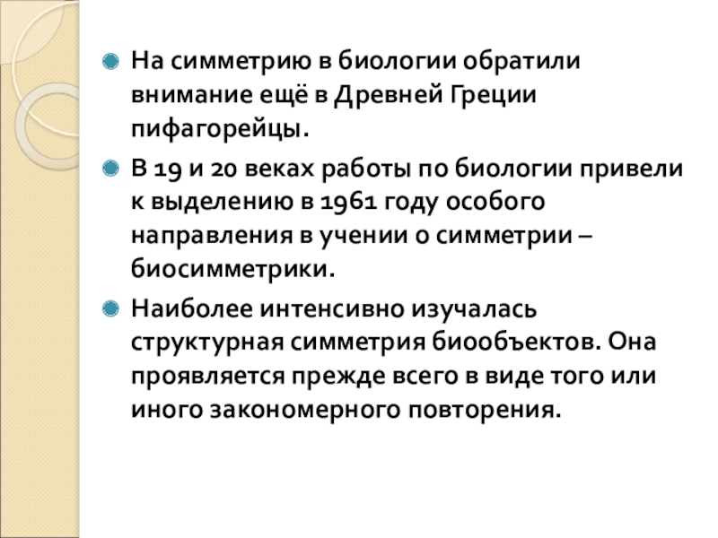 В 19 и 20 веках работы по биологии привели к выделению в 1961 году особого направления в учении о симметрии – биосимметрики.