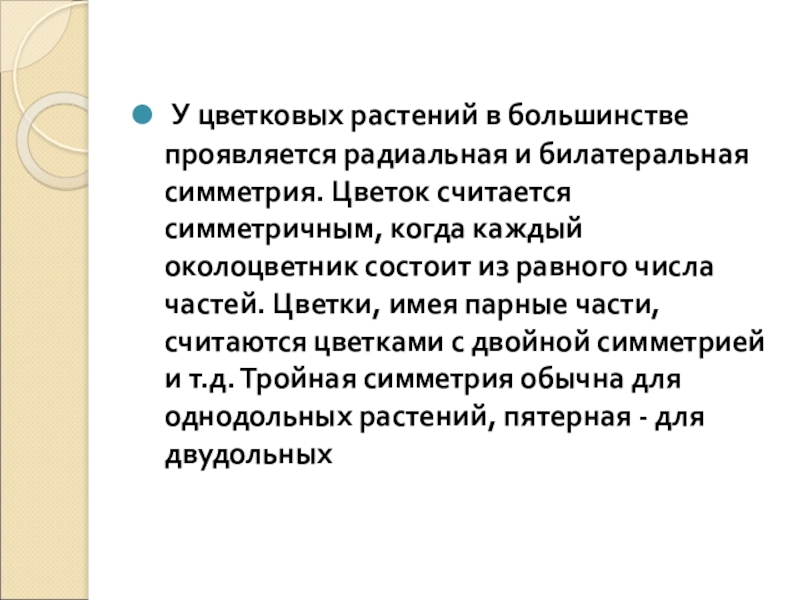 У цветковых растений в большинстве проявляется радиальная и билатеральная симметрия.