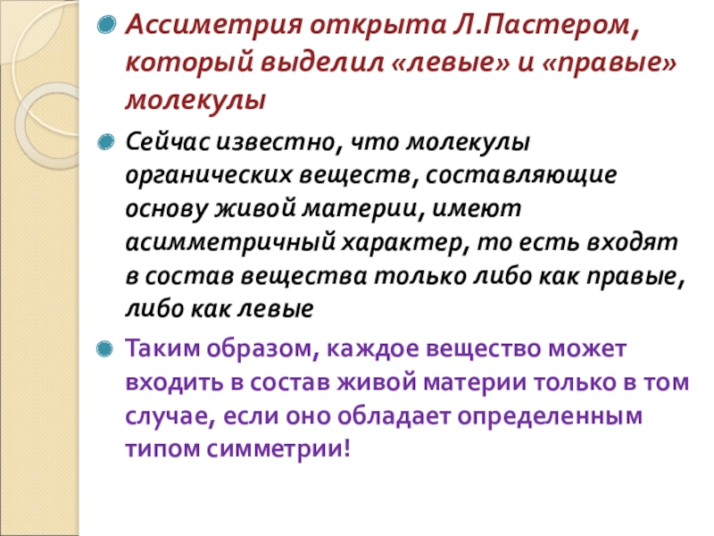 молекулы органических веществ, составляющие основу живой материи, имеют асимметричный характер, то есть входят в состав вещества только либо как правые, либо как левые