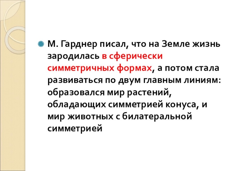 М. Гарднер писал, что на Земле жизнь зародилась в сферически симметричных