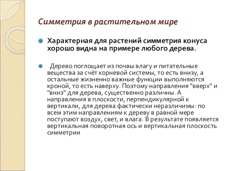 Дерево поглощает из почвы влагу и питательные вещества за счёт корневой системы, то есть внизу, а остальные жизненно важные функции выполняются кроной, то есть наверху. Поэтому направления "вверх" и "вниз" для дерева, существенно различны. А направления в плоскости, перпендикулярной к вертикали, для дерева фактически неразличимы: по всем этим направлениям к дереву в равной мере поступают воздух, свет, и влага. В результате появляется вертикальная поворотная ось и вертикальная плоскость симметрии