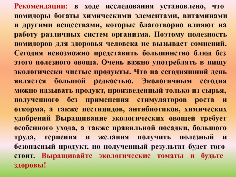 Слайд 19Рекомендации: в ходе исследования установлено, что помидоры богаты химическими элементами, витаминами