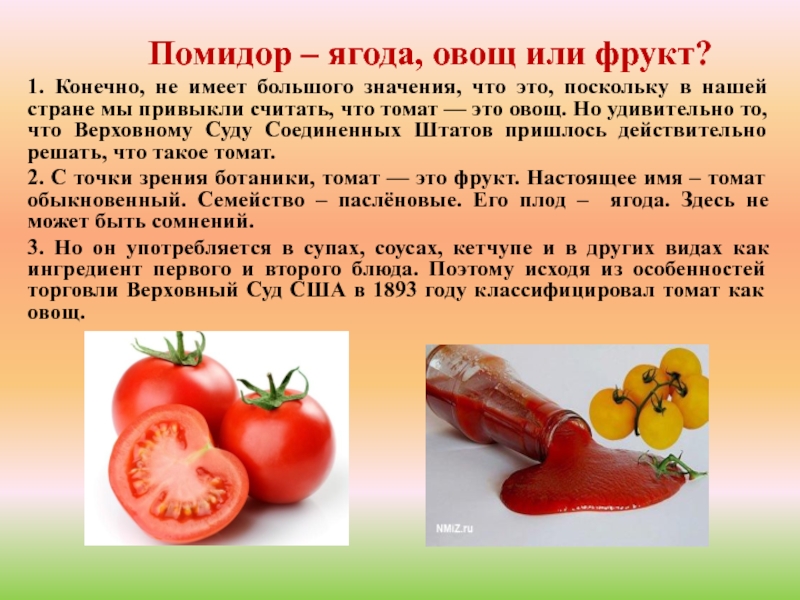 3. Но он употребляется в супах, соусах, кетчупе и в других видах как ингредиент первого и второго блюда. Поэтому исходя из особенностей торговли Верховный Суд США в 1893 году классифицировал томат как овощ.
