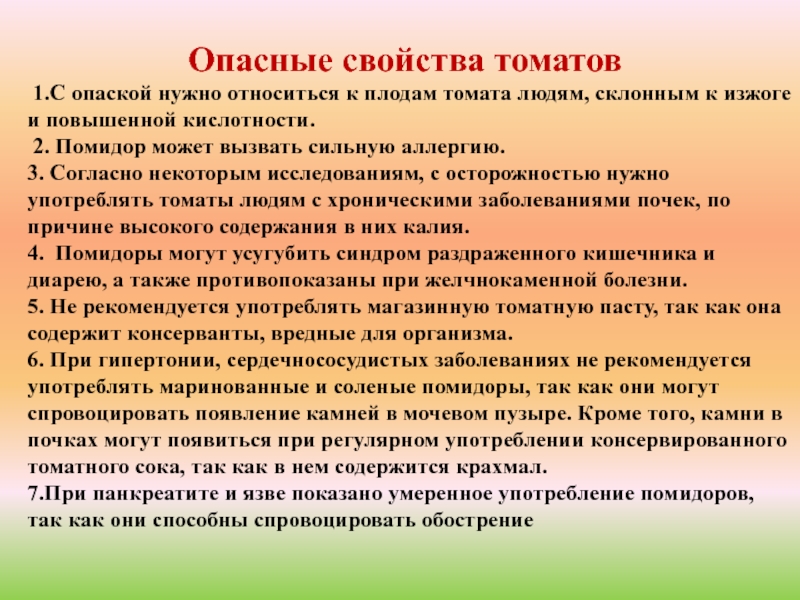 7.При панкреатите и язве показано умеренное употребление помидоров, так как они способны спровоцировать обострение