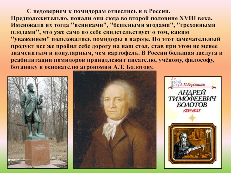 России. Предположительно, попали они сюда во второй половине XVIII века. Именовали их тогда "псинками", "бешеными ягодами", "греховными плодами", что уже само по себе свидетельствует о том, каким "уважением" пользовались помидоры в народе. Но этот замечательный продукт все же пробил себе дорогу на наш стол, став при этом не менее знаменитым и популярным, чем картофель. В России большая заслуга в реабилитации помидоров принадлежит писателю, учёному, философу, ботанику и основателю агрономии А.Т. Болотову.