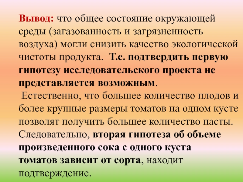 снизить качество экологической чистоты продукта. Т.е. подтвердить первую гипотезу исследовательского проекта не представляется возможным.