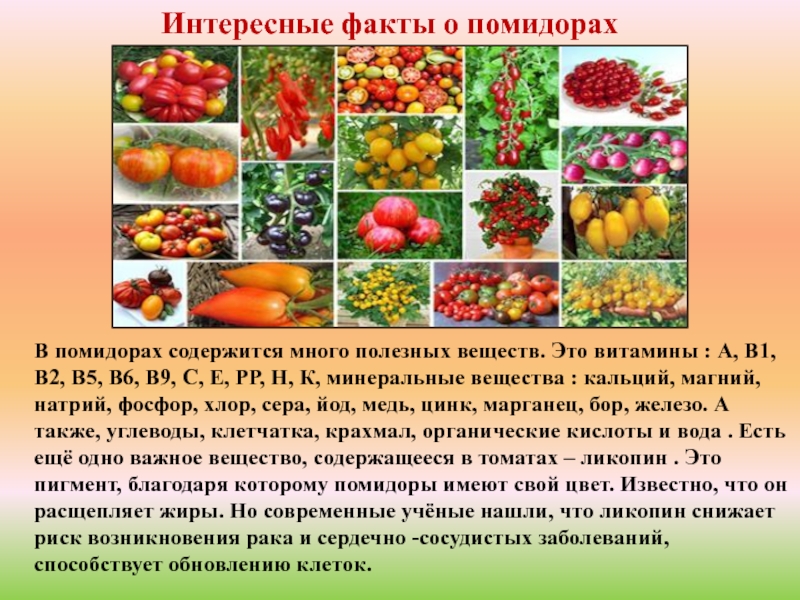 : А, В1, В2, В5, В6, В9, С, Е, РР, Н, К, минеральные вещества : кальций, магний, натрий, фосфор, хлор, сера, йод, медь, цинк, марганец, бор, железо. А также, углеводы, клетчатка, крахмал, органические кислоты и вода . Есть ещё одно важное вещество, содержащееся в томатах – ликопин . Это пигмент, благодаря которому помидоры имеют свой цвет. Известно, что он расщепляет жиры. Но современные учёные нашли, что ликопин снижает риск возникновения рака и сердечно -сосудистых заболеваний, способствует обновлению клеток.