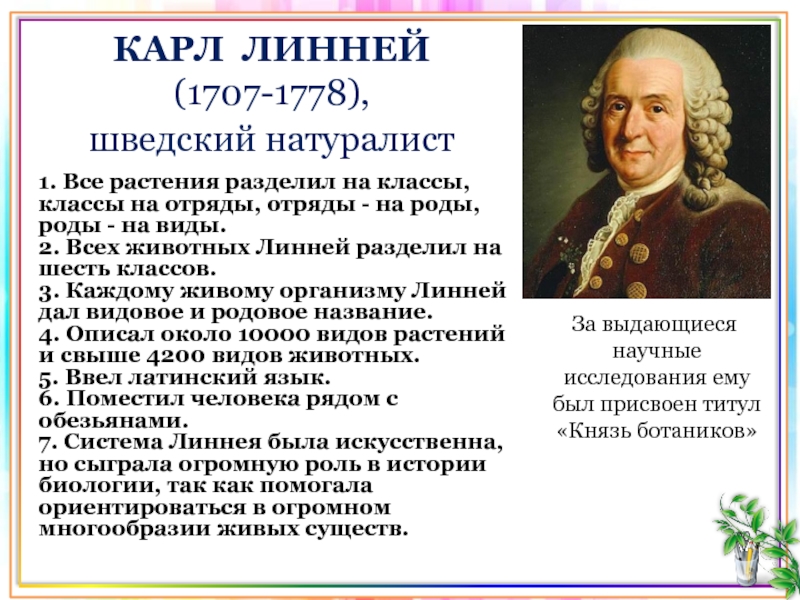 7. Система Линнея была искусственна, но сыграла огромную роль в истории биологии, так как помогала ориентироваться в огромном многообразии живых существ.