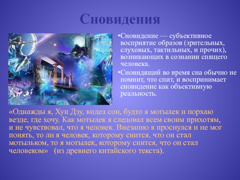 «Однажды я, Хун Дзу, видел сон, будто я мотылек и порхаю везде, где хочу. Как мотылек я следовал всем своим прихотям, и не чувствовал, что я человек. Внезапно я проснулся и не мог понять, то ли я человек, которому снится, что он стал мотыльком, то я мотылек, которому снится, что он стал человеком» (из древнего китайского текста).
