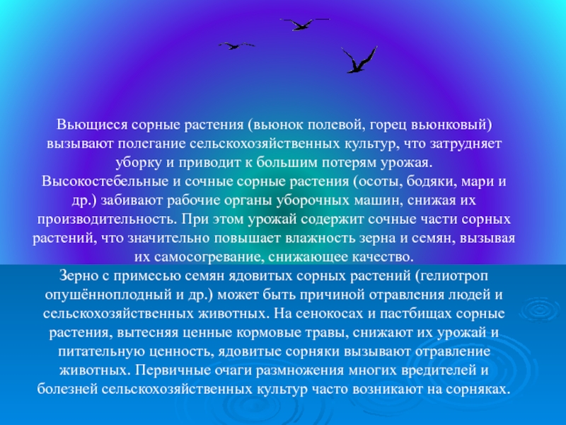 Слайд 2Вьющиеся сорные растения (вьюнок полевой, горец вьюнковый) вызывают полегание сельскохозяйственных культур,