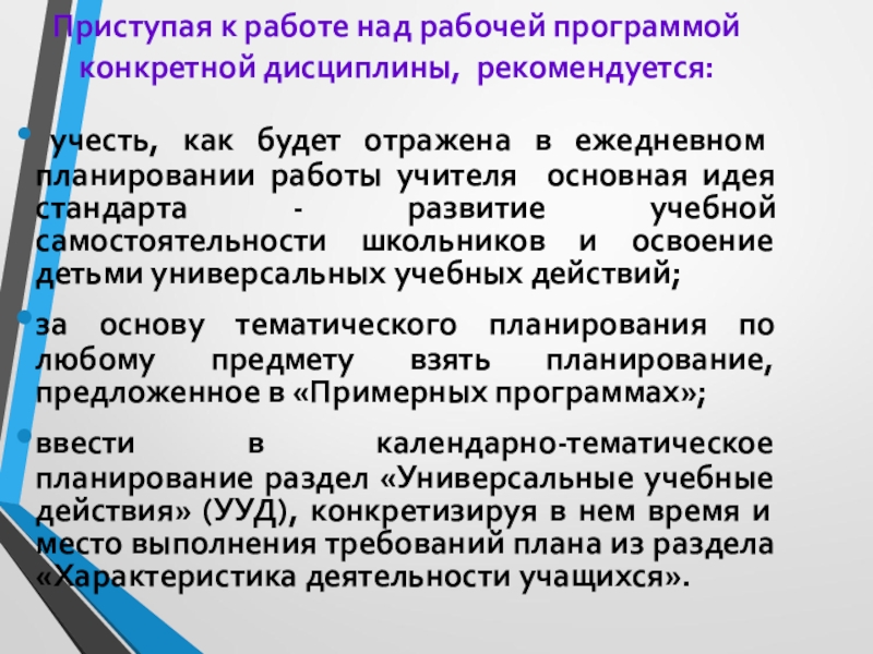 Слайд 21Приступая к работе над рабочей программой конкретной дисциплины, рекомендуется: