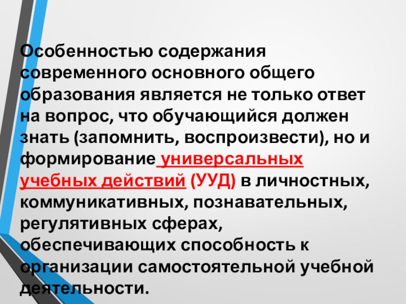 Слайд 13Особенностью содержания современного основного общего образования является не только ответ на