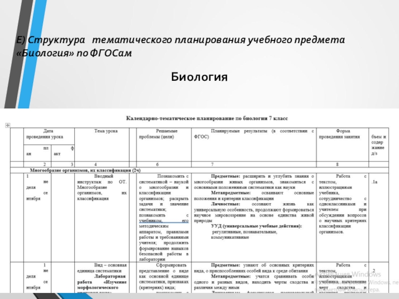 Слайд 20Е) Структура тематического планирования учебного предмета «Биология» по ФГОСам
