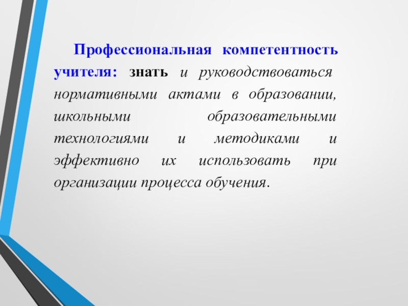 Слайд 3Профессиональная компетентность учителя: знать и руководствоваться нормативными актами в образовании, школьными