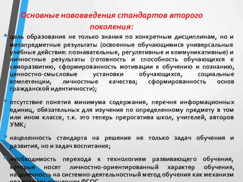 необходимость перехода к технологиям развивающего обучения, которые носят личностно-ориентированный характер обучения, нацеленность на системно-деятельностный метод обучения как механизм реализации концепции ФГОС.
