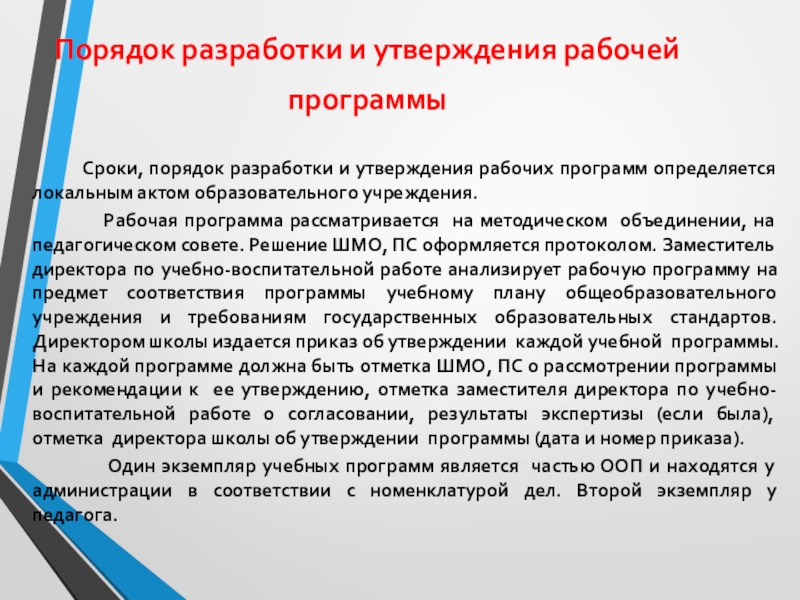 Рабочая программа рассматривается на методическом объединении, на педагогическом совете. Решение ШМО, ПС оформляется протоколом. Заместитель директора по учебно-воспитательной работе анализирует рабочую программу на предмет соответствия программы учебному плану общеобразовательного учреждения и требованиям государственных образовательных стандартов. Директором школы издается приказ об утверждении каждой учебной программы. На каждой программе должна быть отметка ШМО, ПС о рассмотрении программы и рекомендации к ее утверждению, отметка заместителя директора по учебно-воспитательной работе о согласовании, результаты экспертизы (если была), отметка директора школы об утверждении программы (дата и номер приказа).