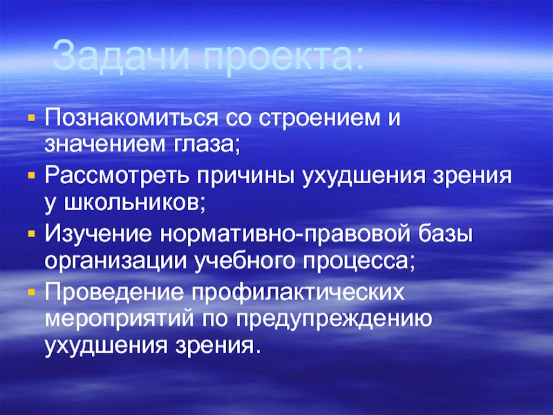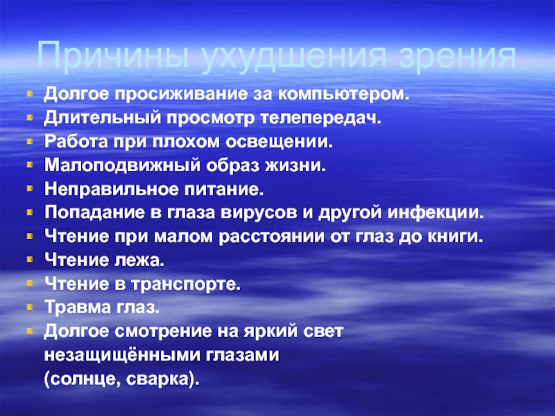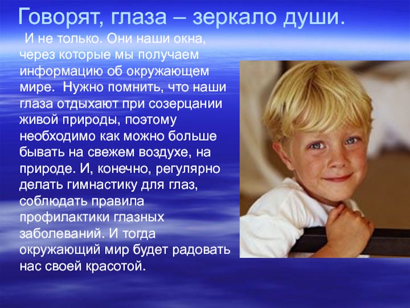 которые мы получаем информацию об окружающем мире. Нужно помнить, что наши глаза отдыхают при созерцании живой природы, поэтому необходимо как можно больше бывать на свежем воздухе, на природе. И, конечно, регулярно делать гимнастику для глаз, соблюдать правила профилактики глазных заболеваний. И тогда окружающий мир будет радовать нас своей красотой.
