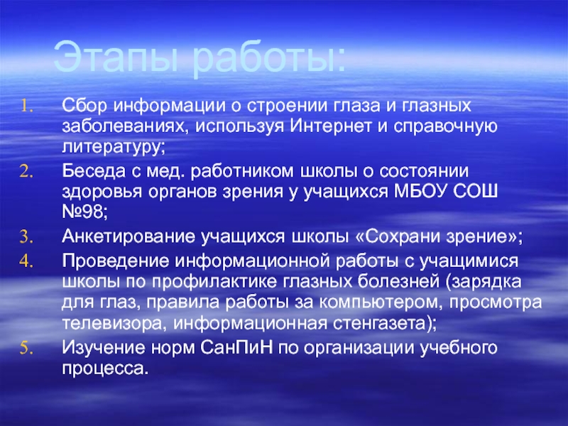 Проведение информационной работы с учащимися школы по профилактике глазных болезней (зарядка для глаз, правила работы за компьютером, просмотра телевизора, информационная стенгазета);