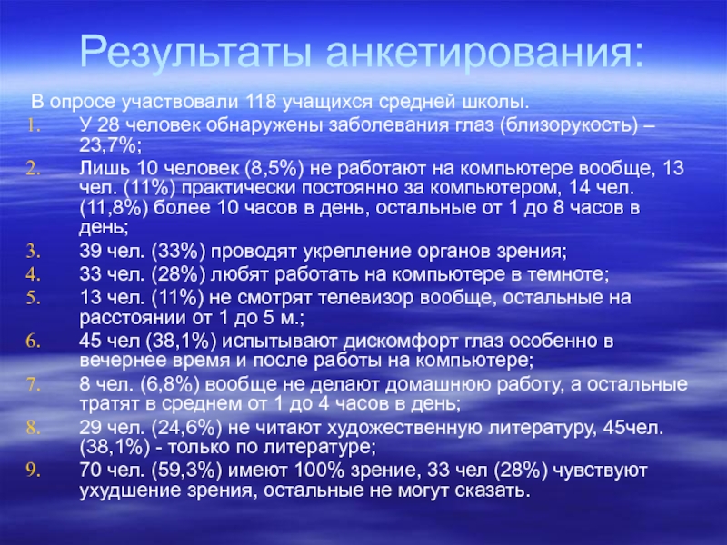 70 чел. (59,3%) имеют 100% зрение, 33 чел (28%) чувствуют ухудшение зрения, остальные не могут сказать.