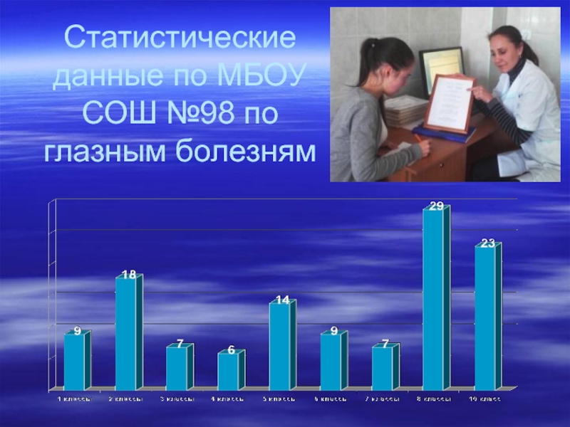 Слайд 7Статистические данные по МБОУ СОШ №98 по глазным болезням