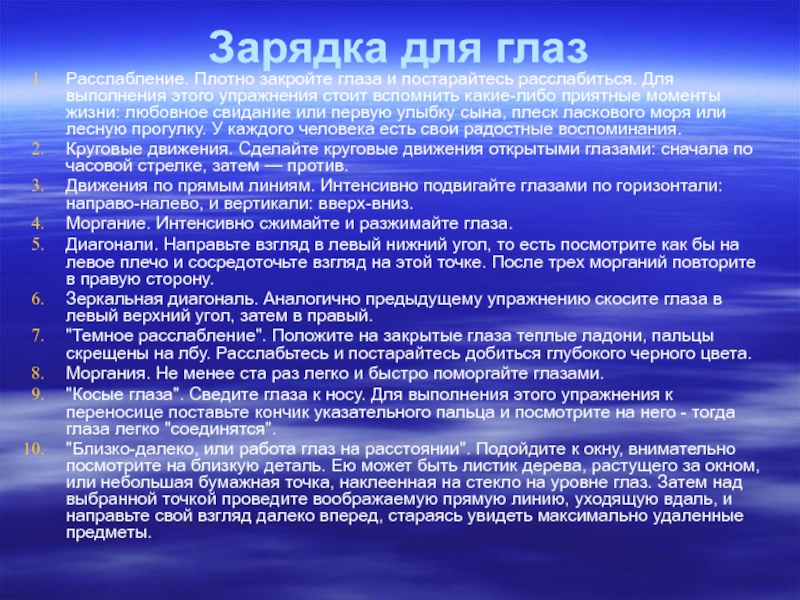 Моргания. Не менее ста раз легко и быстро поморгайте глазами.