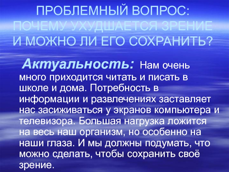 много приходится читать и писать в школе и дома. Потребность в информации и развлечениях заставляет нас засиживаться у экранов компьютера и телевизора. Большая нагрузка ложится на весь наш организм, но особенно на наши глаза. И мы должны подумать, что можно сделать, чтобы сохранить своё зрение.