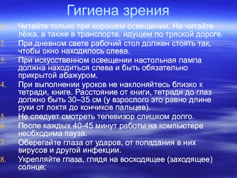 Читайте только при хорошем освещении. Не читайте лёжа, а также