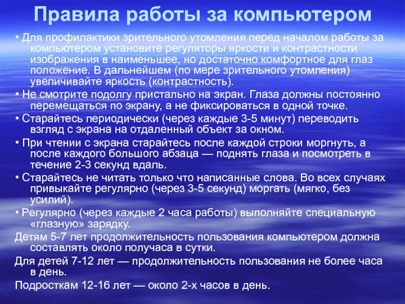 • Старайтесь периодически (через каждые 3-5 минут) переводить взгляд с экрана на отдаленный объект за окном.