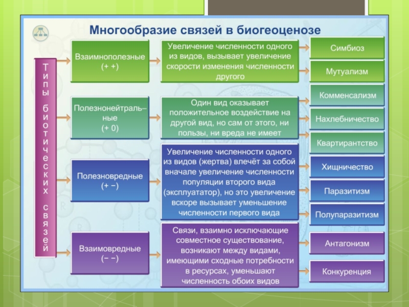 Слайд 2Типы связей и зависимостей в биогеоценозе.