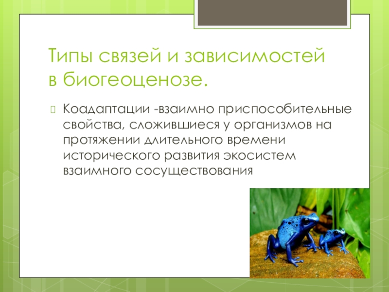 Типы связей и зависимостей в биогеоценозе.Коадаптации -взаимно приспособительные свойства, сложившиеся у организмов на протяжении длительного времени исторического