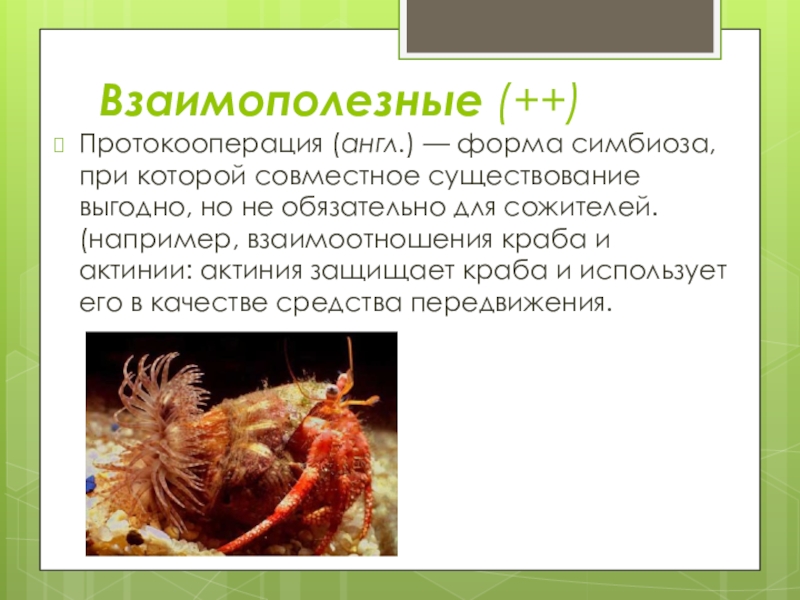 Взаимополезные (++)Протокооперация (англ.) — форма симбиоза, при которой совместное существование выгодно, но не обязательно для сожителей. (например, взаимоотношения краба и