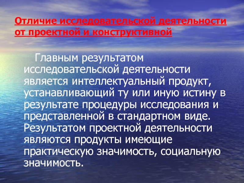 исследовательской деятельности является интеллектуальный продукт, устанавливающий ту или иную истину в результате процедуры исследования и представленной в стандартном виде. Результатом проектной деятельности являются продукты имеющие практическую значимость, социальную значимость.