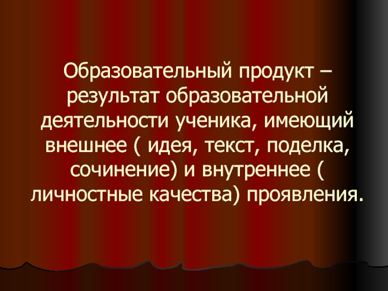 Слайд 16Образовательный продукт – результат образовательной деятельности ученика, имеющий внешнее (
