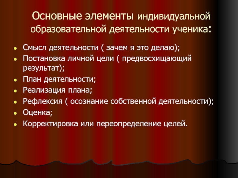 Слайд 17Основные элементы индивидуальной образовательной деятельности ученика:
