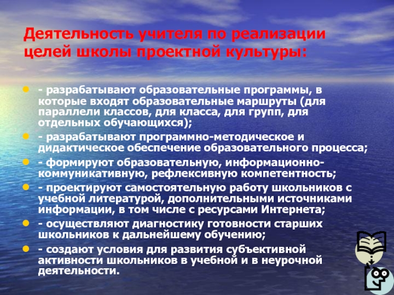 Слайд 2Деятельность учителя по реализации целей школы проектной культуры: