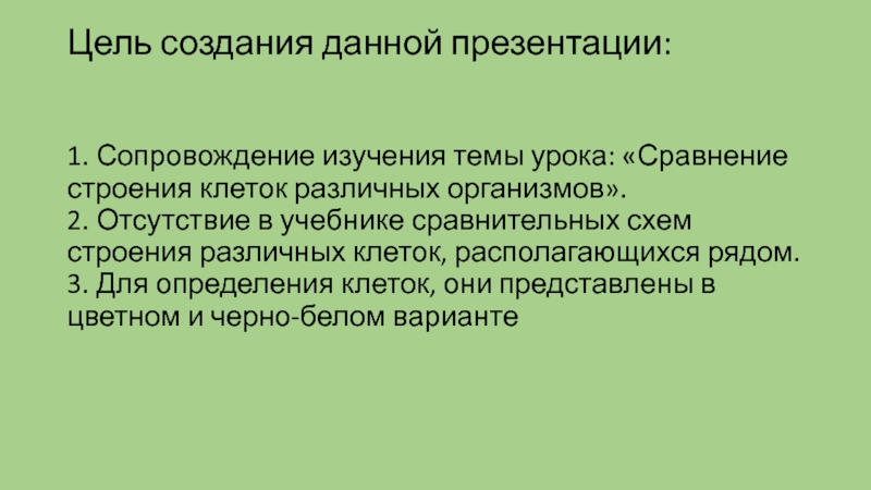 Цель создания данной презентации: 1. Сопровождение изучения темы урока: «Сравнение строения клеток различных организмов». 2. Отсутствие в учебнике сравнительных схем строения различных клеток, располагающихся рядом. 3. Для определения клеток, они представлены в цветном и