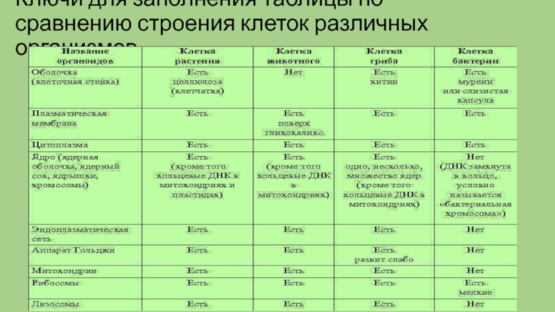 Слайд 8Ключи для заполнения таблицы по сравнению строения клеток различных организмов.