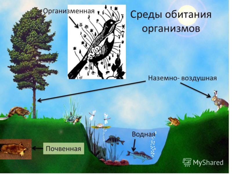 Основными компонентами среды обитания являются: пища, вода, воздух, температура, свет, жилище и другие.
