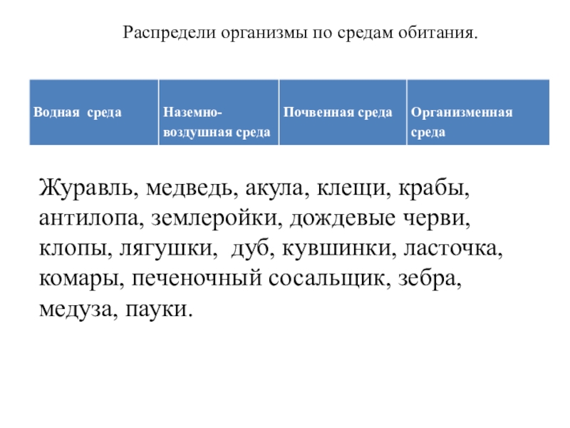 Распредели организмы по средам обитания.  Журавль, медведь, акула, клещи, крабы, антилопа, землеройки, дождевые черви, клопы, лягушки,