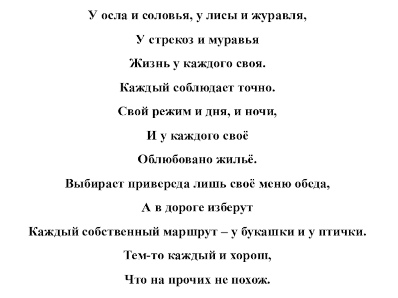 У осла и соловья, у лисы и журавля, У стрекоз и муравья Жизнь у каждого своя. Каждый соблюдает точно. Свой режим и дня, и ночи, И у каждого своё Облюбовано жильё. Выбирает привереда лишь своё меню