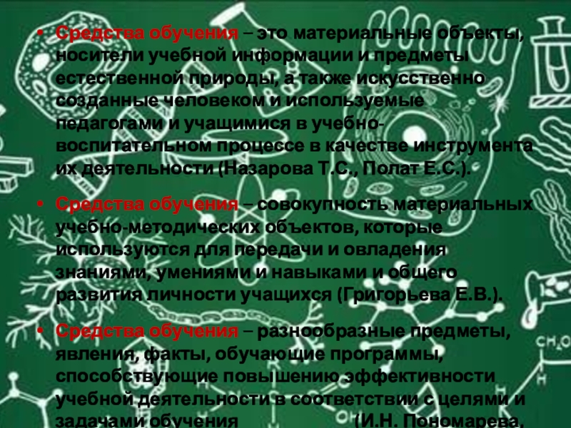 Средства обучения – разнообразные предметы, явления, факты, обучающие программы, способствующие повышению эффективности учебной деятельности в соответствии с целями и задачами обучения (И.Н. Пономарева, В.П. Соломин, Г.Д. Сидельникова).