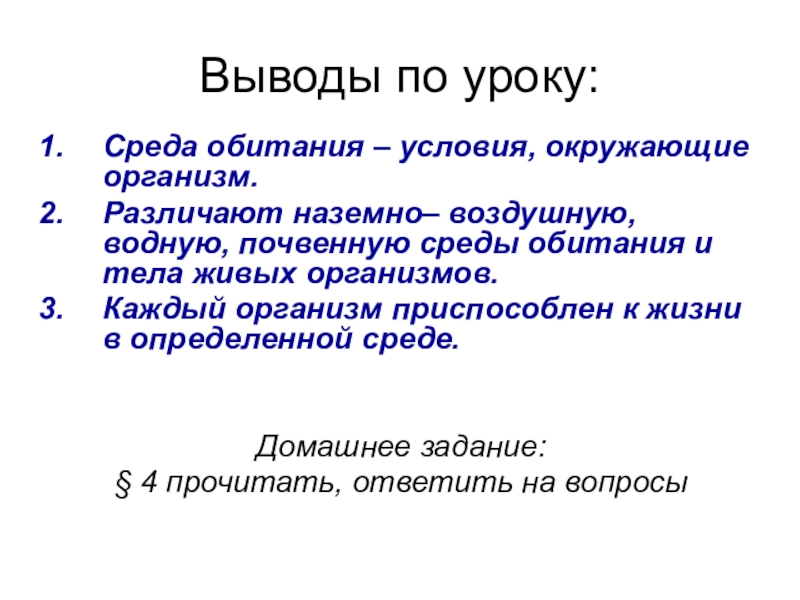 Выводы по уроку:Cреда обитания – условия, окружающие организм.Различают наземно– воздушную, водную, почвенную среды обитания и тела живых