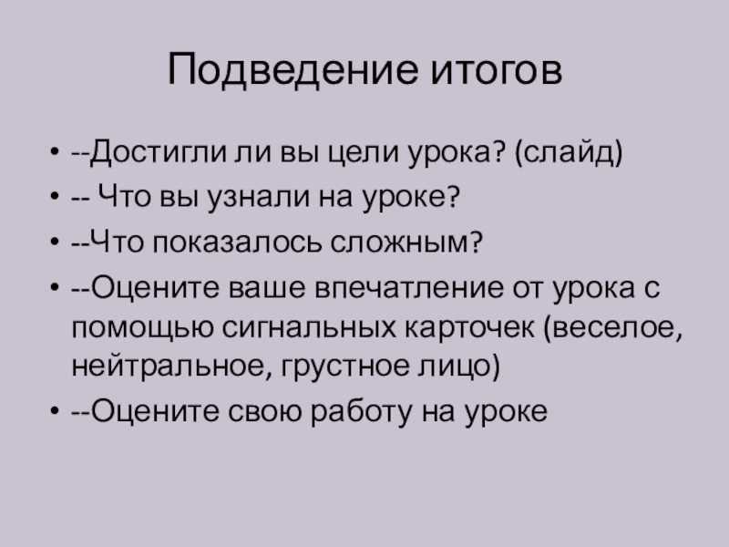 --Оцените ваше впечатление от урока с помощью сигнальных карточек (веселое, нейтральное, грустное лицо)
