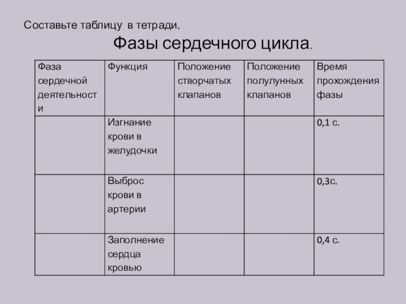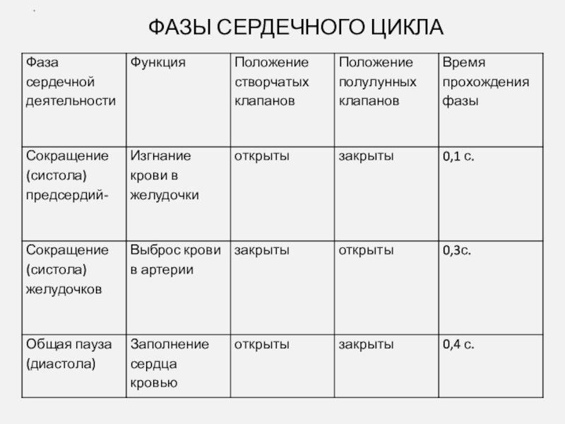 В течение 0,3 с. Предсердия расслаблены, открываются полулунные клапаны, створчатые
