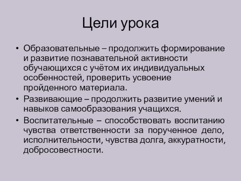 3) Воспитательные – переводить знания в убеждения, воспитывать ответственности аккуратность при выполнении учебных навыков работы с книгой, тетрадью, компьютером, формировать коммуникативные умения.