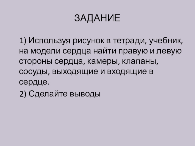 1) Используя рисунок в тетради, учебник, на модели сердца