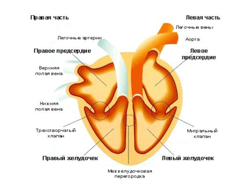 найти правую и левую стороны сердца, камеры, клапаны, сосуды, выходящие и входящие в сердце.