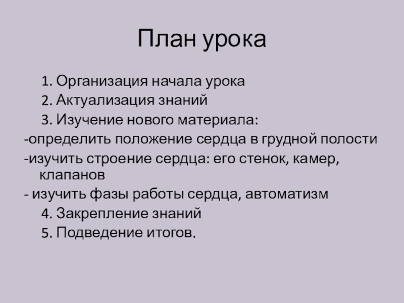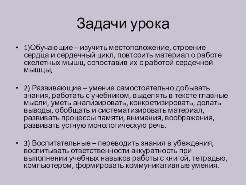 1)Обучающие – изучить местоположение, строение сердца и сердечный цикл, повторить