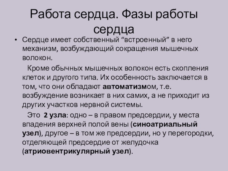 Кроме обычных мышечных волокон есть скопления клеток и другого типа. Их особенность заключается в том, что они обладают автоматизмом, т.е. возбуждение возникает в них самих, а не приходит из других участков нервной системы.