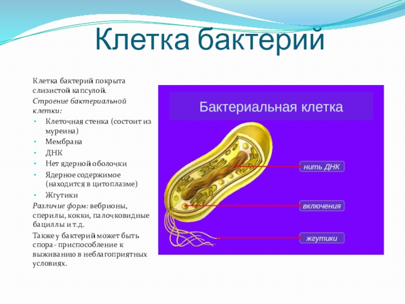 Также у бактерий может быть спора- приспособление к выживанию в неблагоприятных условиях.